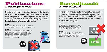 Mediante un folleto explicativo (PDF), del que la consejería de Educiación y Cultura ha repartido 30.000 ejemplares, se advierte que ‘cualquier publicación, material o campaña del Gobierno ha de hacerse en lengua catalana. No se pueden hacer versiones bilingües. Pueden ser excepciones las ediciones para recién llegados, con el catalán como primera lengua, y las turísticas, situadas en el exterior’.