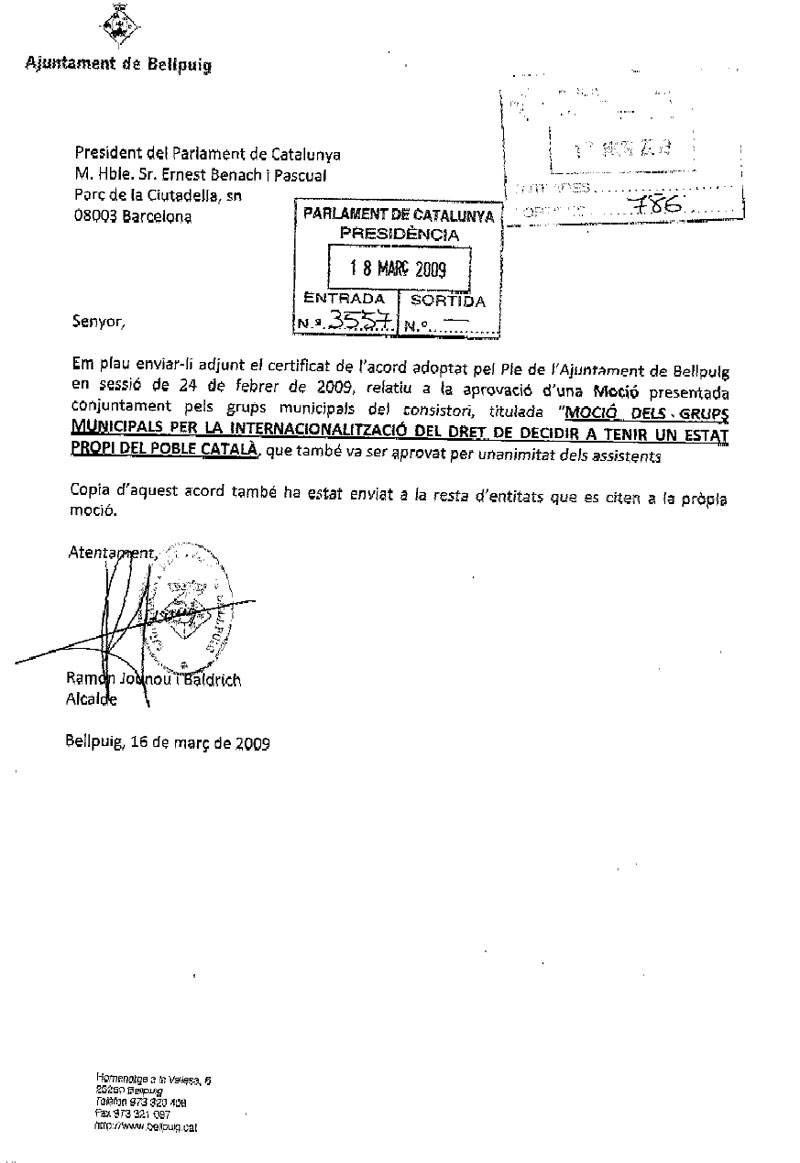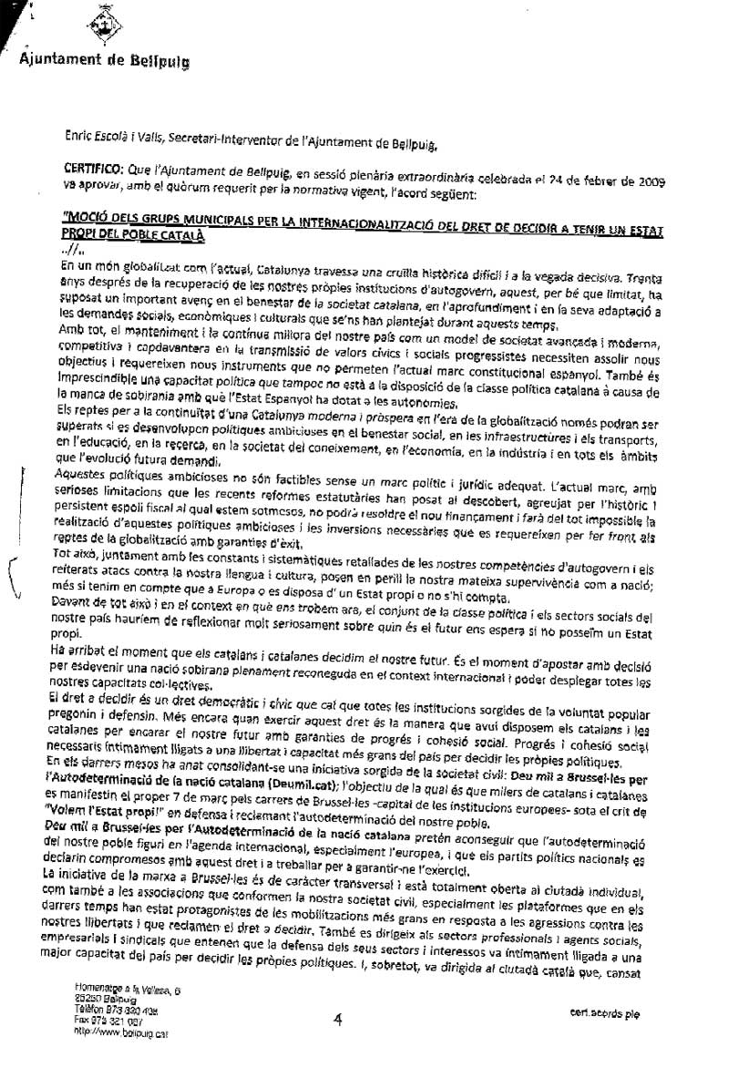 El Ayuntamiento de Bellpuig (Lérida) aprobó el pasado 24 de febrero una moción a favor de la ‘internacionalización del derecho a decidir tener un Estado propio del pueblo catalán‘ a propuesta de CiU, ERC y PSC. También se denuncia un ‘histórico y persistente expolio fiscal‘ contra Cataluña.