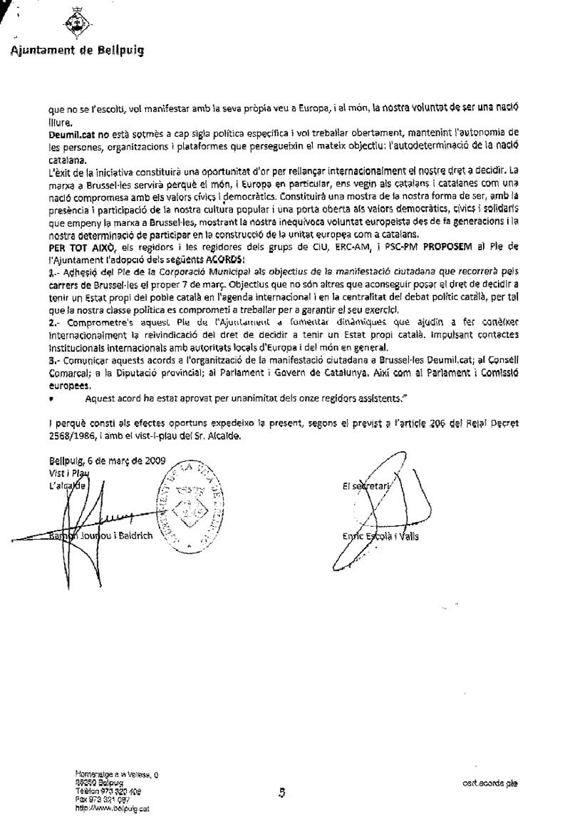 La moción termina remarcando el apoyo del Consistorio a la manifestación independentista ‘Diez mil en Bruselas por la Autodeterminación’ celebrada el pasado 7 de marzo ‘bajo el grito ¡Queremos el Estado propio!‘.