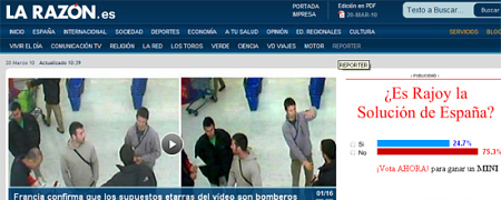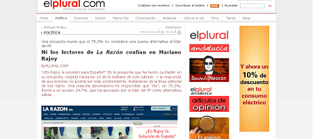 Un anuncio publicitario en la versión digital de La Razón que preguntaba si Mariano Rajoy, presidente del PP, ‘es la solución para España’, y cuyo ficticio resultado mostraba que el 75,3% no confiaba en el líder de la oposición para resolver los problemas del país, ha sido interpretado por el diario digital El Plural como una encuesta real.