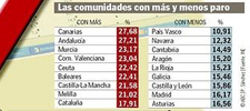Por Comunidades Autónomas, Cataluña tiene un paro del 17,91%, con 676.200 parados. Destaca, por negativo, el paro registrado en Canarias (27,68%), Andalucía (27,21%), Murcia (23,17%) y Comunidad Valenciana (23,04%). Frente a estas CCAA, las que menos paro registran son País Vasco (10,91%), Navarra (12,32%) y Cantabria (14,49%).