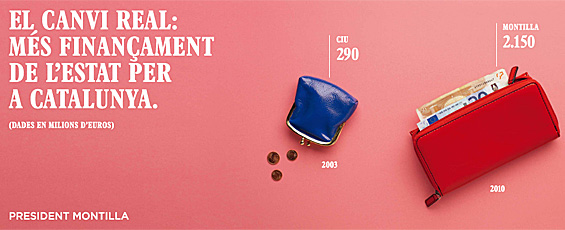 En los carteles no se cita al PSC, ni aparece su logo, sino que aparecen firmados por el ‘presidente Montilla’ y, curiosamente, tres de ellos están escritos en castellano, al contrario que los de la campaña sociates.cat.