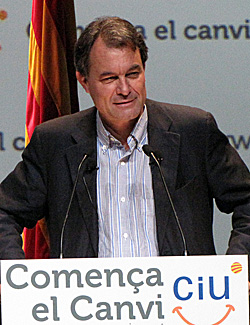 Artur Mas, en un atril con el lema de la campaña de CiU 'Empieza el cambio'.