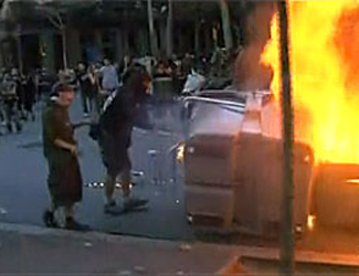 Dos jóvenes radicales queman un container en Barcelona, durante la jornada de huelga general de ayer (foto: vídeo).