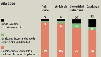Cataluña, en 2009 -fecha del estudio-, da resultados similares a los del conjunto de España en… 1986. Otro de los datos más significativos, de los publicados por La Vanguardia, es que en la Comunidad Valenciana se pueden encontrar los porcentajes más altos de ciudadanos partidarios, directamente, de una dictadura. Aunque, es cierto, en la comunidad vecina hay un mayor número porcentual -hasta siete puntos- de defensores o partidarios de la democracia. Las comparaciones Cataluña-País Vasco son aún, si caben, peores para los ciudadanos de nuestra comunidad