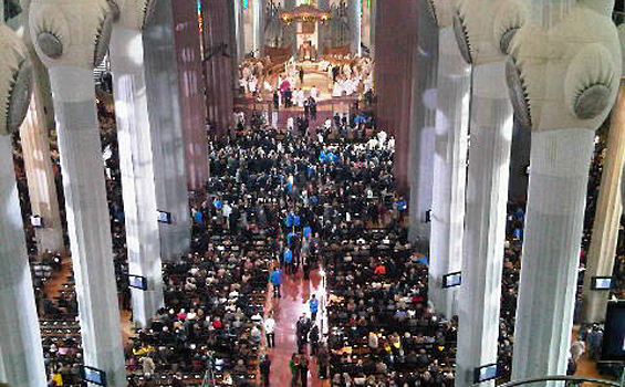 Llegan José Bono, que ha sido silbado por una parte de los asistentes -también lo ha sido Carod-Rovira-, y José Montilla. El papamóvil está a punto de salir del Arzobispado. El interior del templo está ya prácticamente lleno. (Foto: Guillem Carol/Twitter).