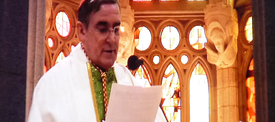 El cardenal arzobispo de Barcelona se dirige a Benedicto XVI, primero en catalán y luego en español, para darle la bienvenida al templo. Cita a Antonio Gaudí, verdadero protagonista de la Sagrada Familia. El Papa entrega un caliz al templo.