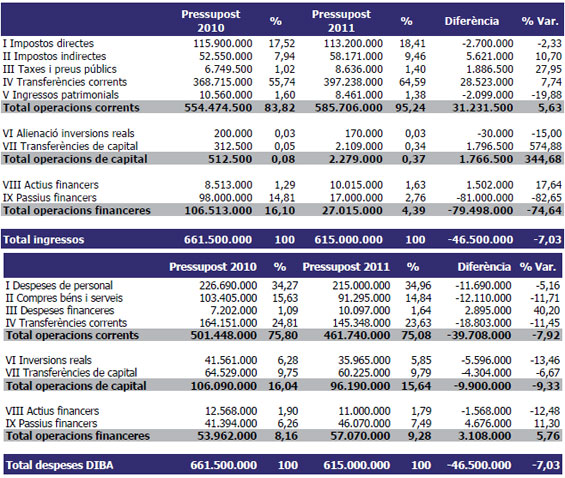 Resumen los Presupuestos de la Diputación de Barcelona para 2011 (fuente: Diputación de Barcelona).