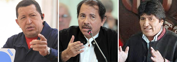 Los dirigentes de Venezuela, Hugo Chávez, Nicaragua, Daniel Ortega, y Bolivia, Evo Morales.