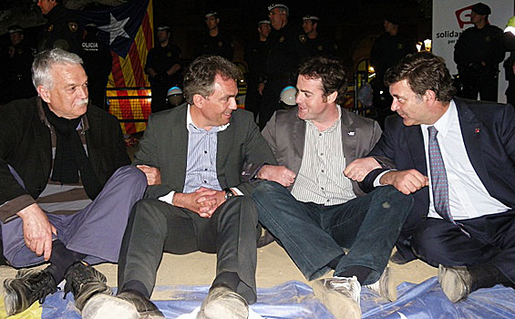 Toni Strubell, Santiago Espot, Uriel Bertran y Alfons López Tena, acampados frente al Parlamento autonómico de Cataluña (foto: Solidaritat).