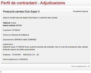 Tal y como consta en las adjudicaciones de la CCMA, la empresa Mailteck S.A. se encargará los próximos cuatro años de gestionar la base de datos del Club Súper 3 y la ‘confección de los carnets’ que se envían a los niños cuando se dan de alta. El contrato ha sido adjudicado el pasado 13 de marzo.