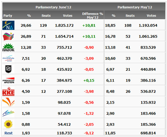 El partido conservador Nueva Democracia (ND), liderado por Antonis Samarás, ha sido el partido más votado en las elecciones legislativas celebradas este domingo en Grecia con el 29,66% de los votos, lo que le permitiría obtener 129 de los 300 escaños del Parlamento (al recibir el bonus de 50 diputados que la legislación griega otorga al vencedor), 21 más que en los comicios celebrados en mayo pasado y cuyo resultado altamente fraccionado impidió la formación de un gobierno.