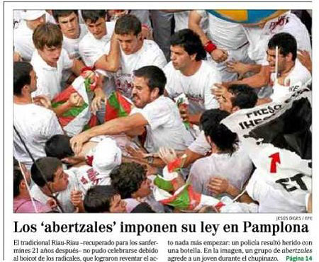 Un acertado titular de foto, el de este sábado en El Mundo, que hace innecesario más apunte o pie de foto. Esta es la ley para algunos. La ley del puñetazo. En Pamplona llevan 21 años sin Riau-Riau porque la voluntad de los violentos se impone.