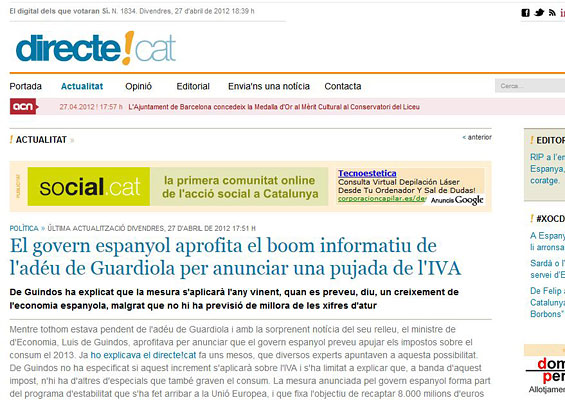 No es solo una forma de ver el mundo, el nacionalismo también es una visión distorsionada de la realidad. La imagen que ven en este post es una captura de la noticia de Directe.cat sobre la medida anunciada por el Gobierno para subir algunos impuestos en 2013. Tenemos un Gobierno aprovechado. Que Guardiola deja el Barça, subimos los impuestos. Así, sin más. Imagínese qué hará este malvado Gobierno cuando sea Mourinho el que deje (o le echen) del club blanco. Esto no pasaría de una simple broma (y algo residual en lo profesional) si no fuera porque este titular lo hemos pagado todos. Sí. En 2011, Directe.cat recibió, solo del departamento autonómico que depende de Francesc Homs (CiU), portavoz de la Generalidad, 7.259,52 euros; y en 2010, solo de la Consejería de Cultura, 138.224,79 euros. Hombre, hombre, ‘boom informativo’…