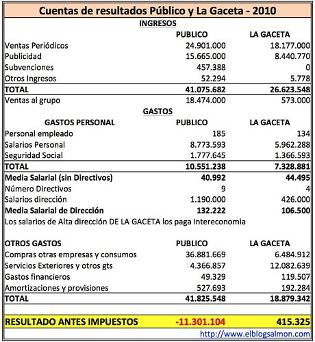 Comparativa de las cuentas de resultados de 'Público' y 'La Gaceta' de 2010 (datos: El Blog Salmón).