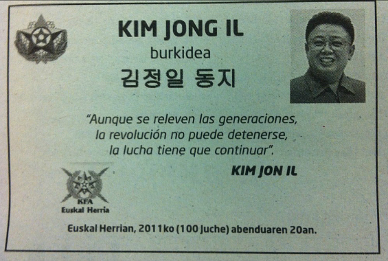 La Asociación de Euskal Herria de apoyo a Corea del Norte ha plantado una esquela en Gara en honor al dictador Kin Jong-Il fallecido este fin de semana. El texto de la esquela, y la esquela en sí, se comentan solos. Esquelas.