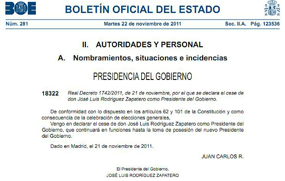 Zapatero ya es presidente en funciones, tras las elecciones generales. Aparece publicado hoy en el BOE. Juan Carlos I: “Vengo en declarar el cese de don José Luis Rodríguez Zapatero como Presidente del Gobierno, que continuará en funciones hasta la toma de posesión del nuevo Presidente del Gobierno”.