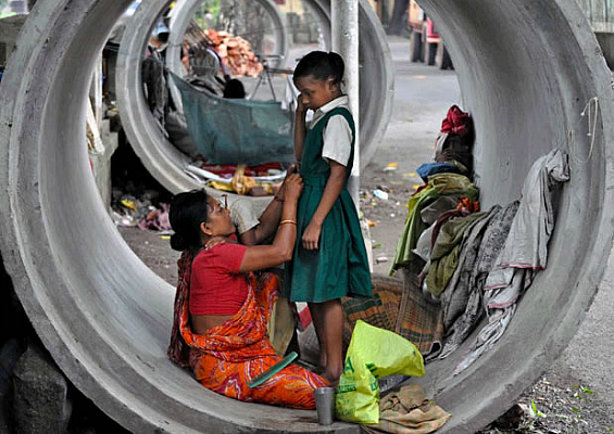 Una madre de la India viste y arregla a su hija, que está a punto de partir al colegio (foto: Gautam Basu).