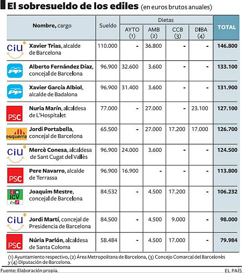 El País trae este miércoles un resumen de los sueldos y, sobre todo, sobresueldos de algunos concejales y alcaldes de Barcelona y poblaciones de alrededor. La conclusión es sencilla, el político cobra poco, sí; pero las dietas hay que eliminarlas.