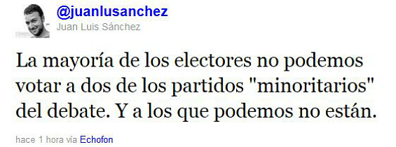 Así es la asimetría vasco-catalana. Debate político a cinco en TVE de cara al 20N con dos partidos que solo se presentan en siete provincias. El mismo debate deja fuera a un partido que se presenta en toda España y tiene representación en el Congreso. ¿Qué propuesta de CiU y PNV puede interesar al electorado de fuera de Cataluña y el País Vasco? Ninguna. Jamás les podrán pasar cuentas en las urnas. Eso sí, cualquier debate en TV3 o en la desconexión de TVE para Cataluña se contará con los partidos con representación por la Comunidad. ¿Por qué no está en estos debates el PSOE? ¿Por qué no convocan al PNV en los debates de TV3? No tendría sentido. Tampoco lo tiene que estén CiU y PNV en un debate de propuestas políticas a nivel nacional.