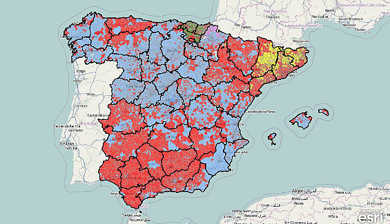Espectacular mapa de España dividido por municipios y colores, según el partido más votado en las elecciones generales de 2008 en cada localidad.