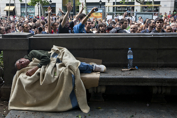 Un mendigo descansa en un banco de la plaza de Cataluña mientras los 'indignados' protestan por el desalojo de la acampada (foto: Flickr acampadabcnfoto).